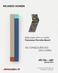 A mostra reúne trabalhos recentes do artista mineiro Ricardo Homen, cuja pintura explora a força expansiva da cor. Em suas telas, a cor vai além de organizar a composição: ela cria campos vibrantes que envolvem o olhar e sugerem uma experiência espacial. Como destaca o curador Francesco Perrotta-Bosch, trata-se de uma pintura que convida a uma experiência sensível direta, marcada pela intensidade cromática e por uma percepção mais livre e contemplativa.