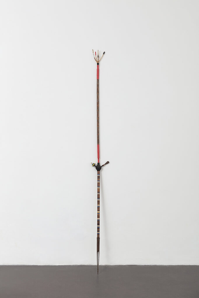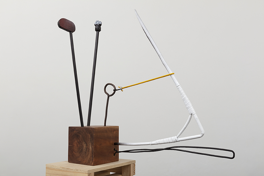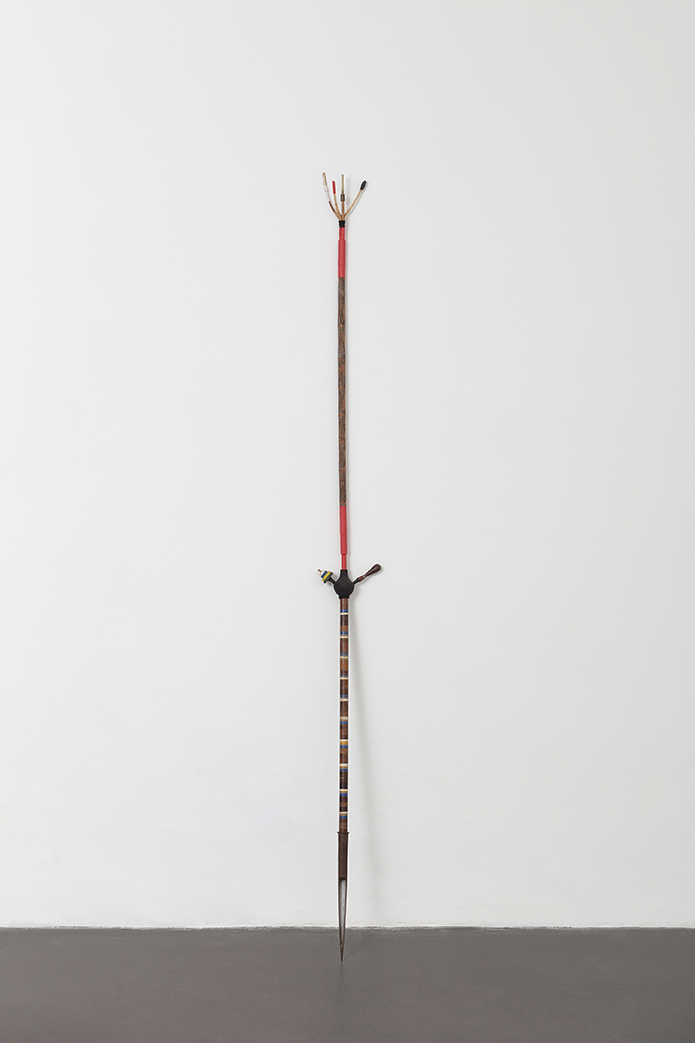 Madeira, metal, barbante, piteiras de madeira e plástico, cabo de aço, tubo termo retrátil, bandagem, esmalte sintético e tinta acrílica