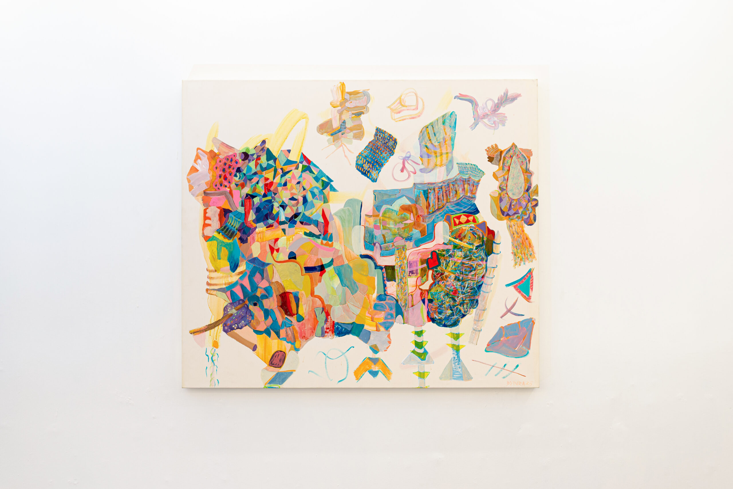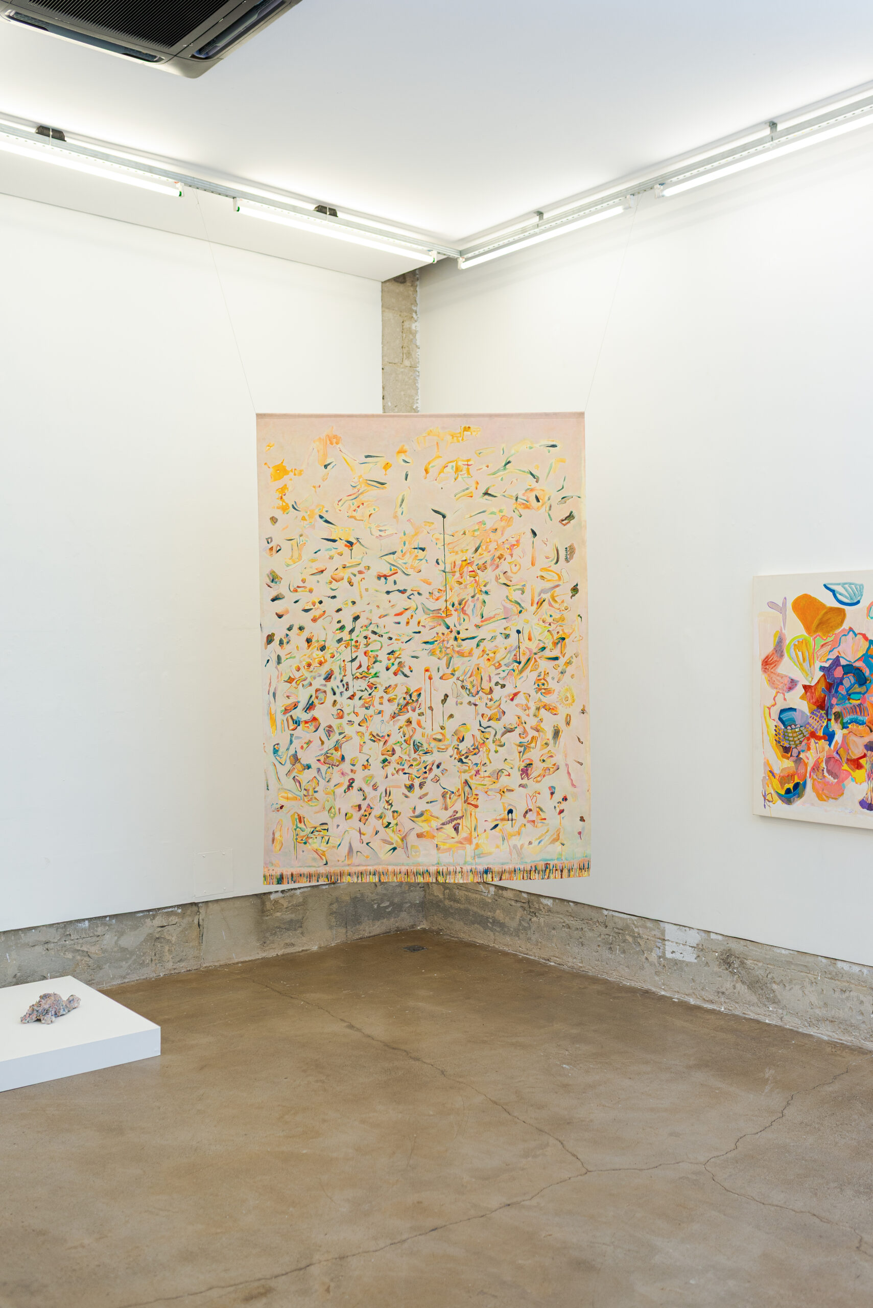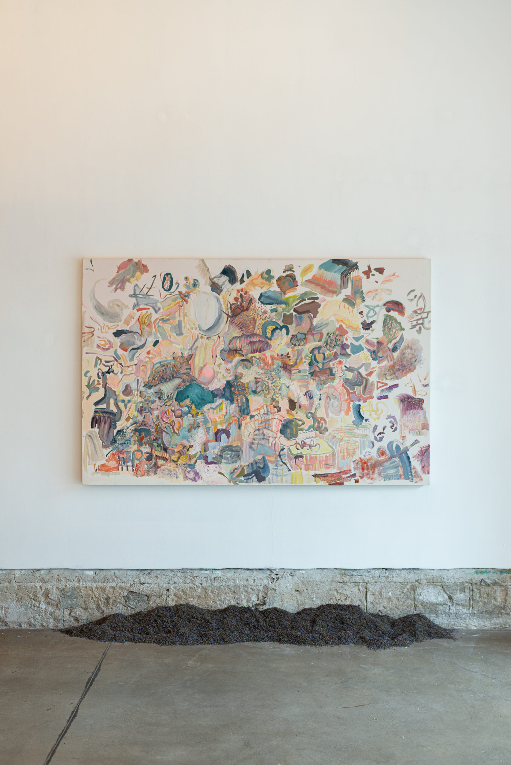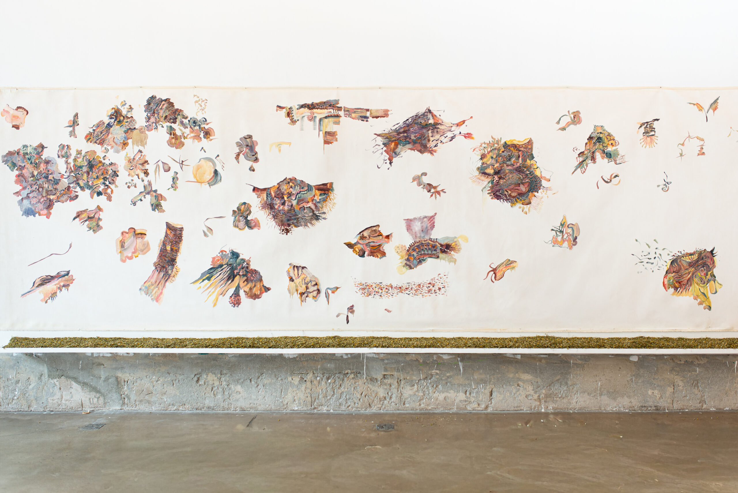 Neste espaço imersivo, a pintura deixa de ser suporte e torna-se presença. Esticadas diretamente nas paredes, as grandes telas revelam seu processo como matéria viva: camadas de gestos, manchas, espirais, caminhos cósmicos e não-euclidianos. Cerâmicas brotam da terra, como ervas daninhas cultivadas de propósito. Os corpos, humanos ou não, se dissolvem em emaranhados de formas e cores que se recusam ao controle.