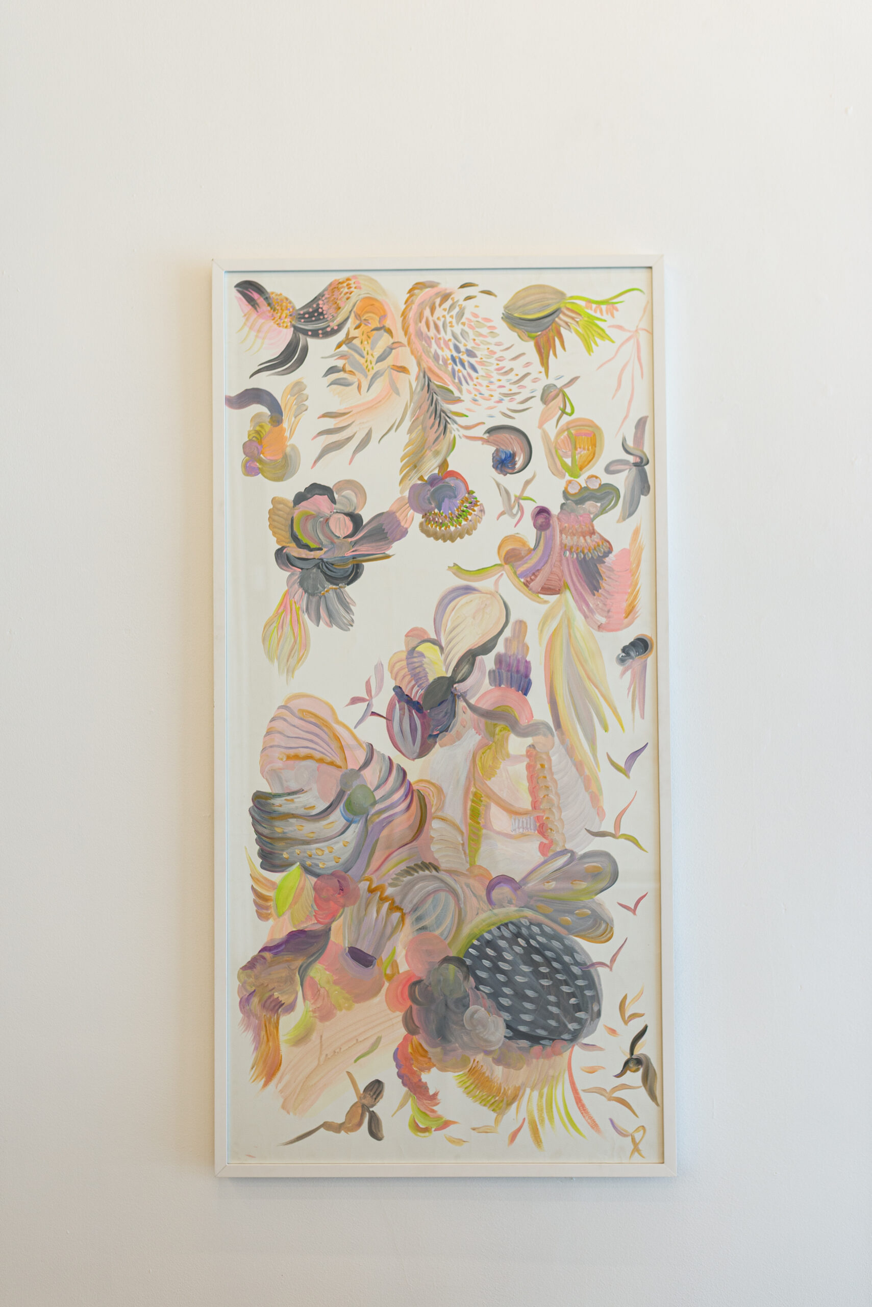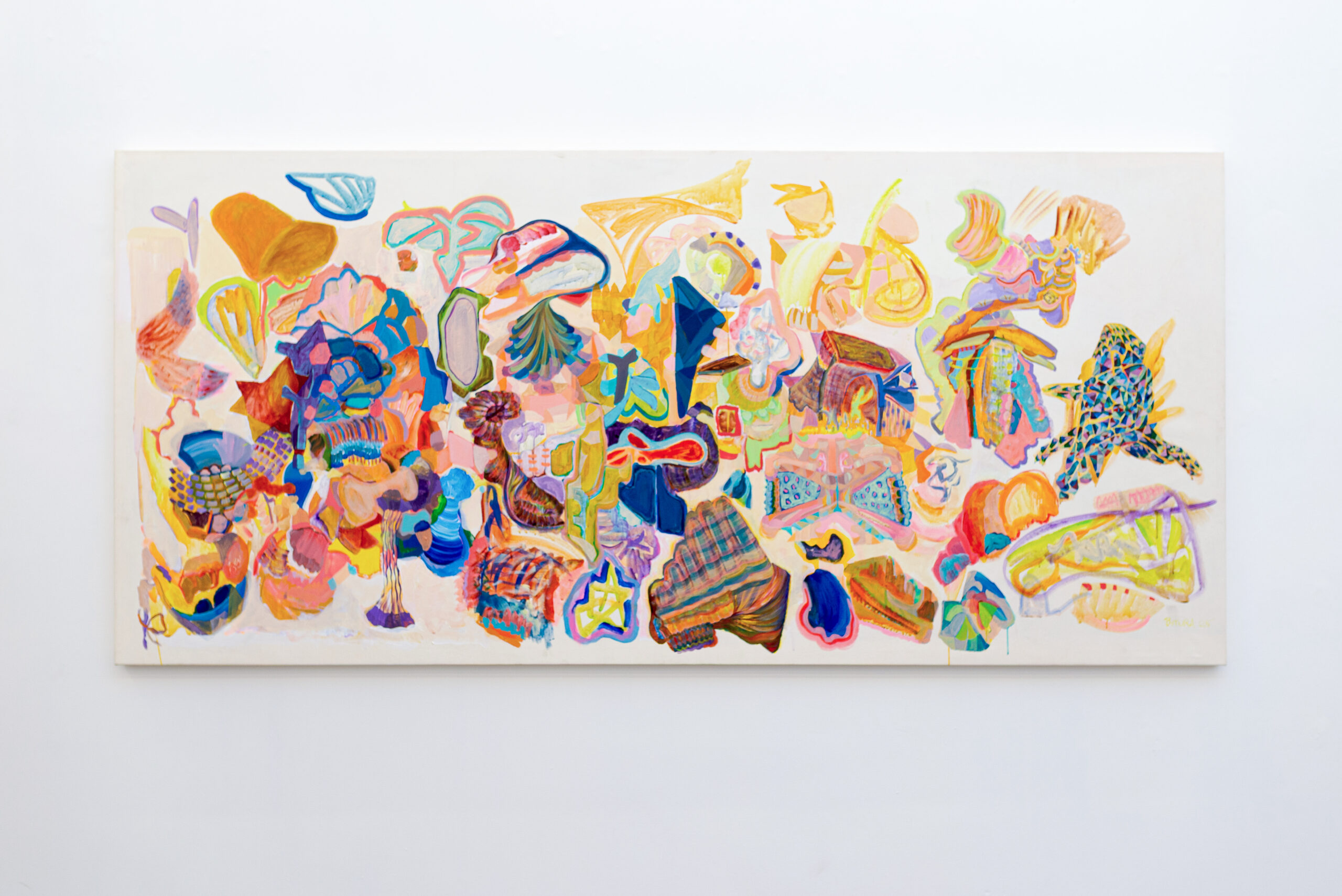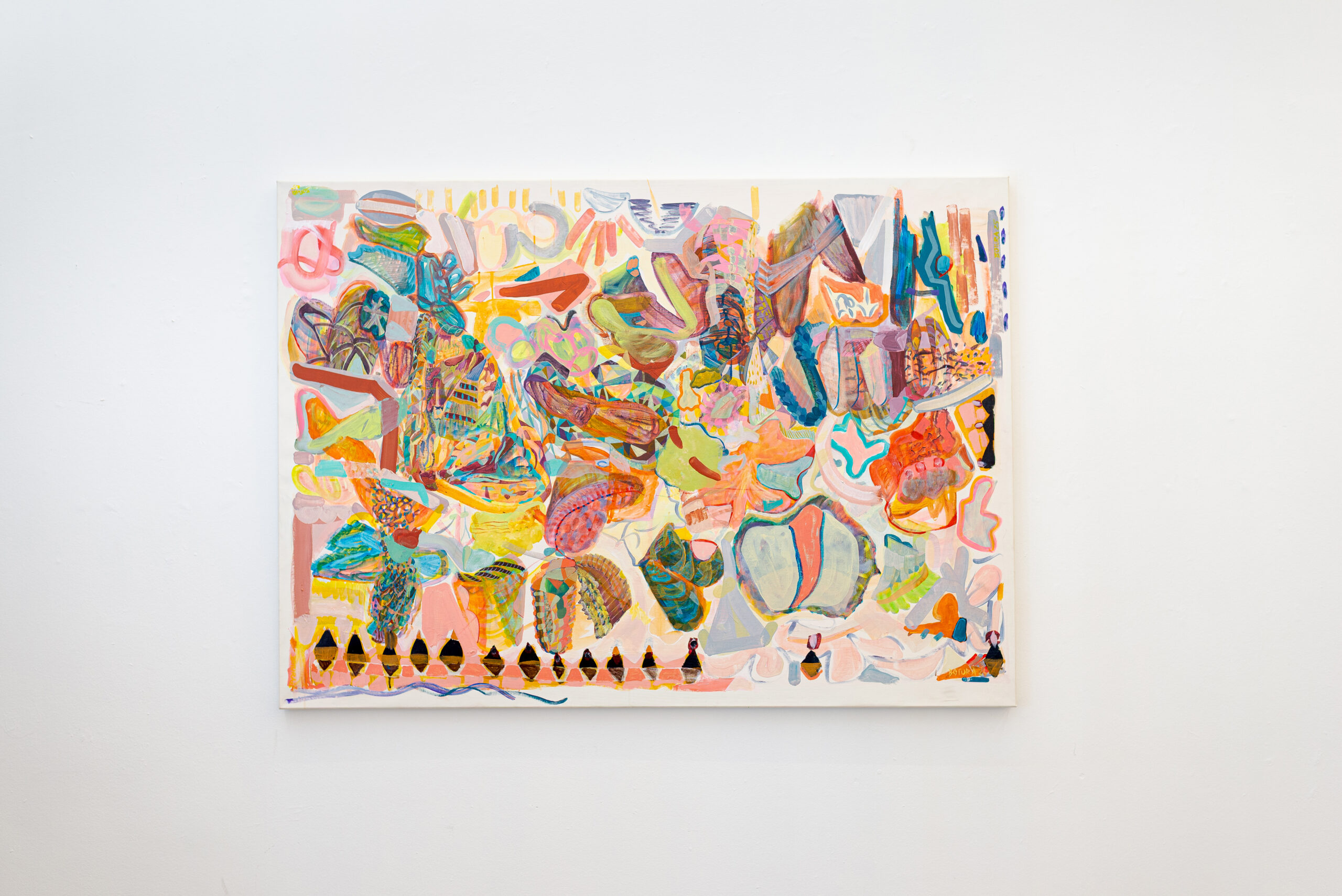 Neste espaço imersivo, a pintura deixa de ser suporte e torna-se presença. Esticadas diretamente nas paredes, as grandes telas revelam seu processo como matéria viva: camadas de gestos, manchas, espirais, caminhos cósmicos e não-euclidianos. Cerâmicas brotam da terra, como ervas daninhas cultivadas de propósito. Os corpos, humanos ou não, se dissolvem em emaranhados de formas e cores que se recusam ao controle.