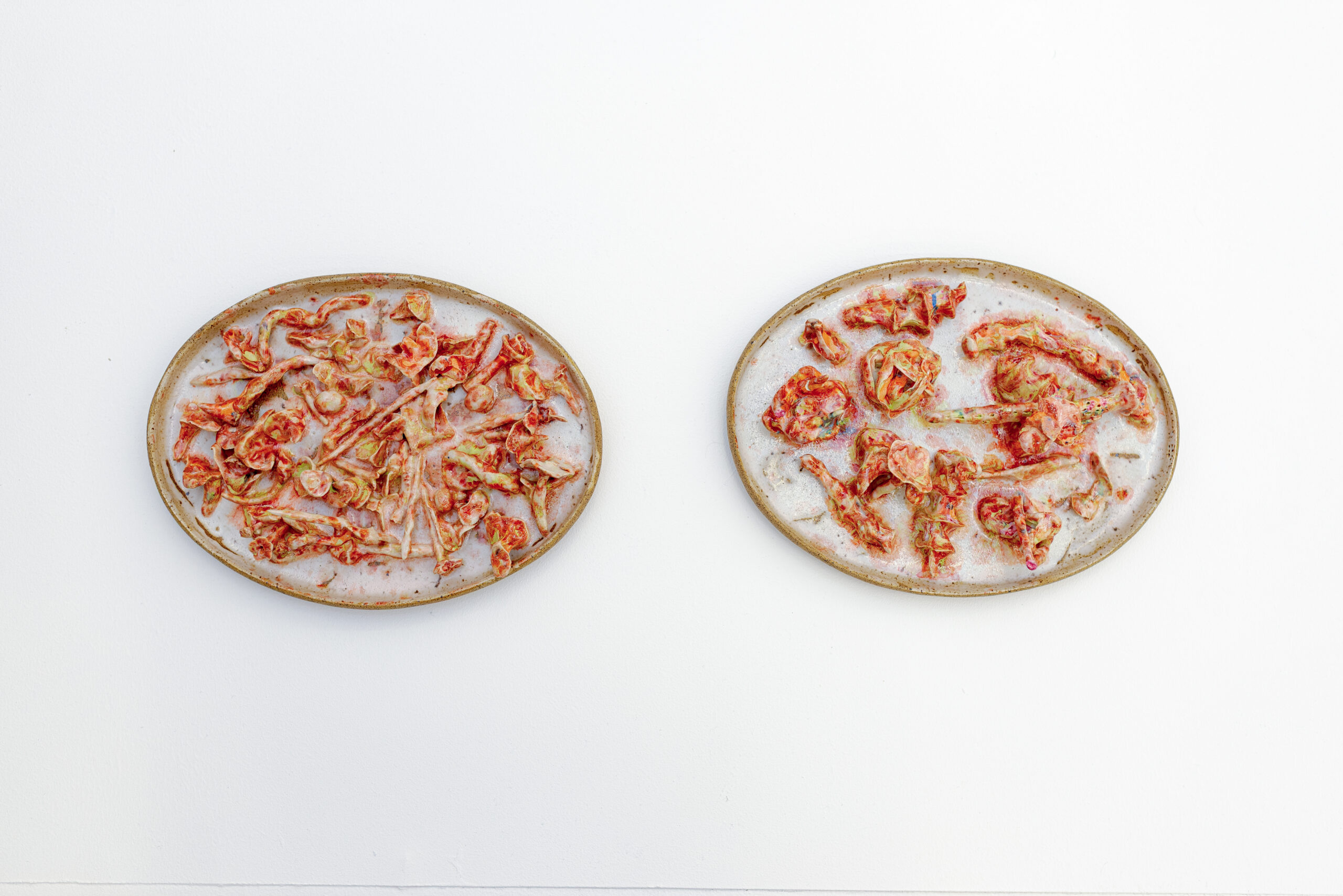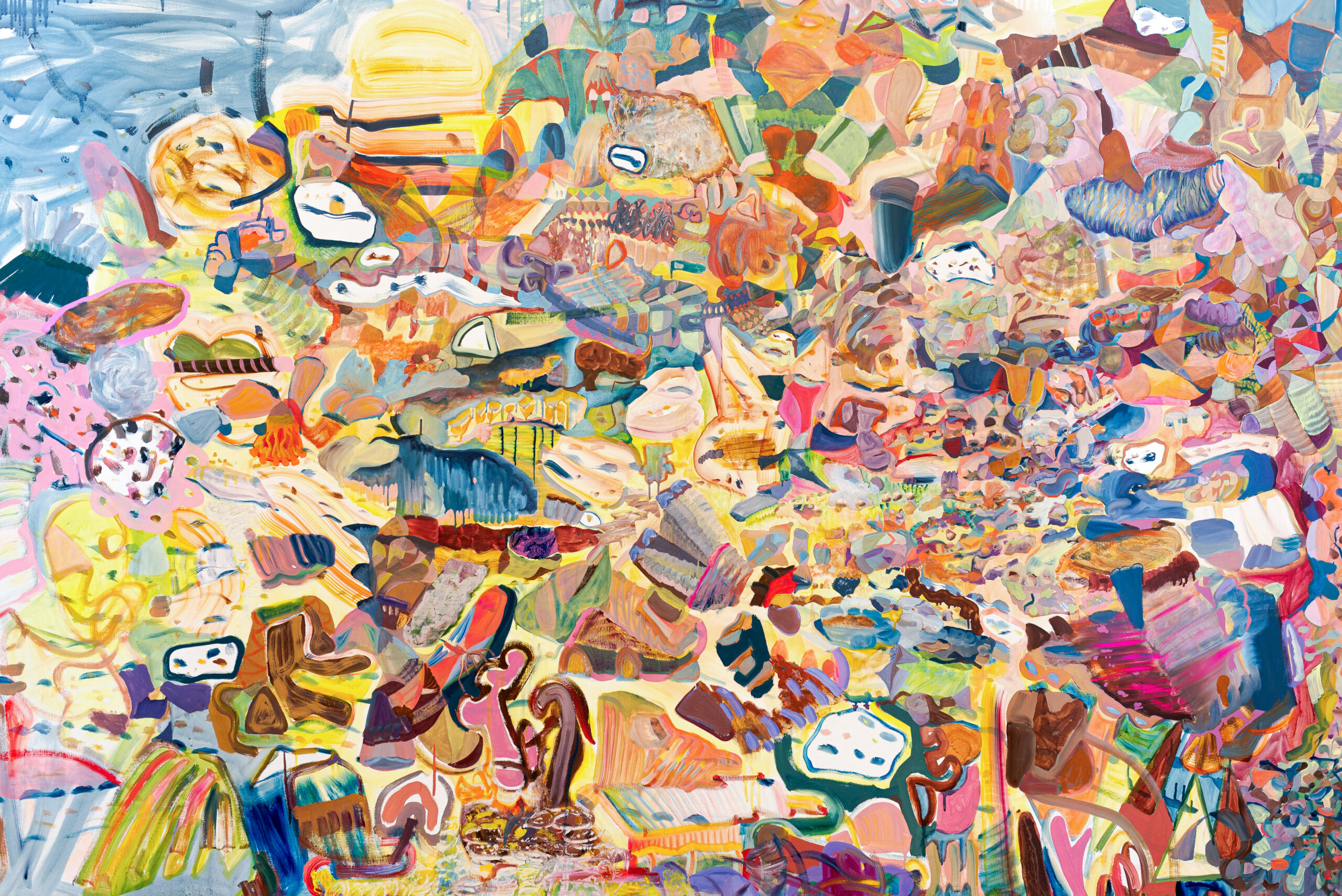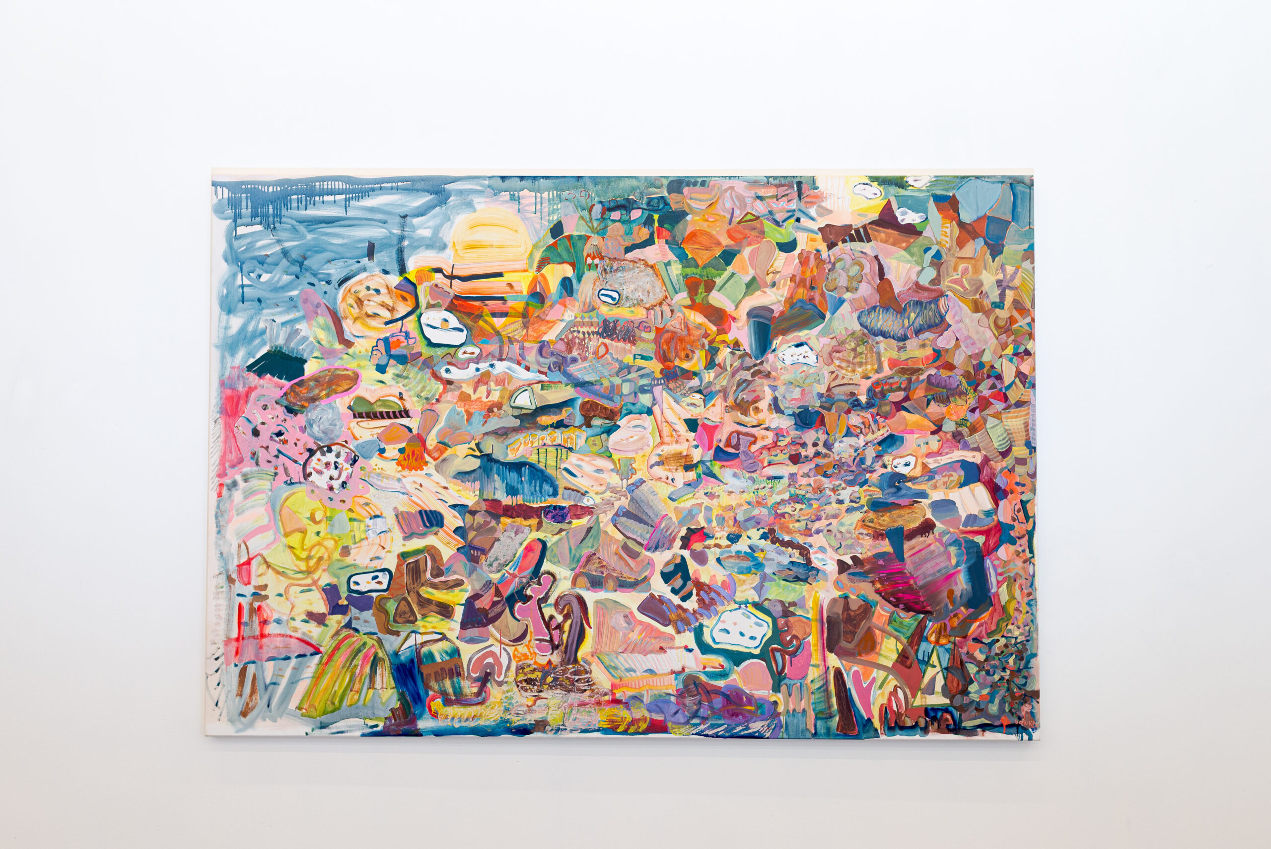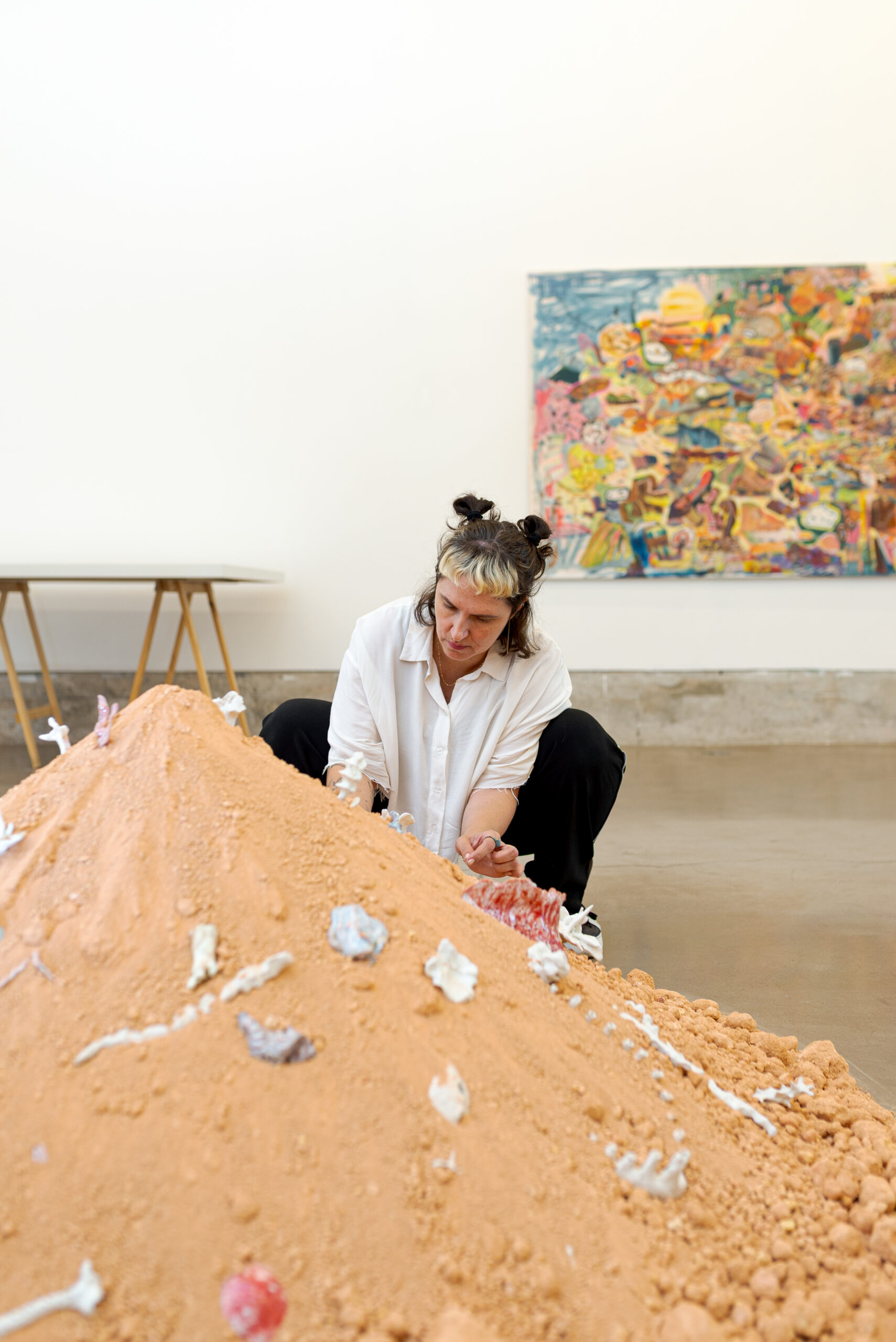 Neste espaço imersivo, a pintura deixa de ser suporte e torna-se presença. Esticadas diretamente nas paredes, as grandes telas revelam seu processo como matéria viva: camadas de gestos, manchas, espirais, caminhos cósmicos e não-euclidianos. Cerâmicas brotam da terra, como ervas daninhas cultivadas de propósito. Os corpos, humanos ou não, se dissolvem em emaranhados de formas e cores que se recusam ao controle.