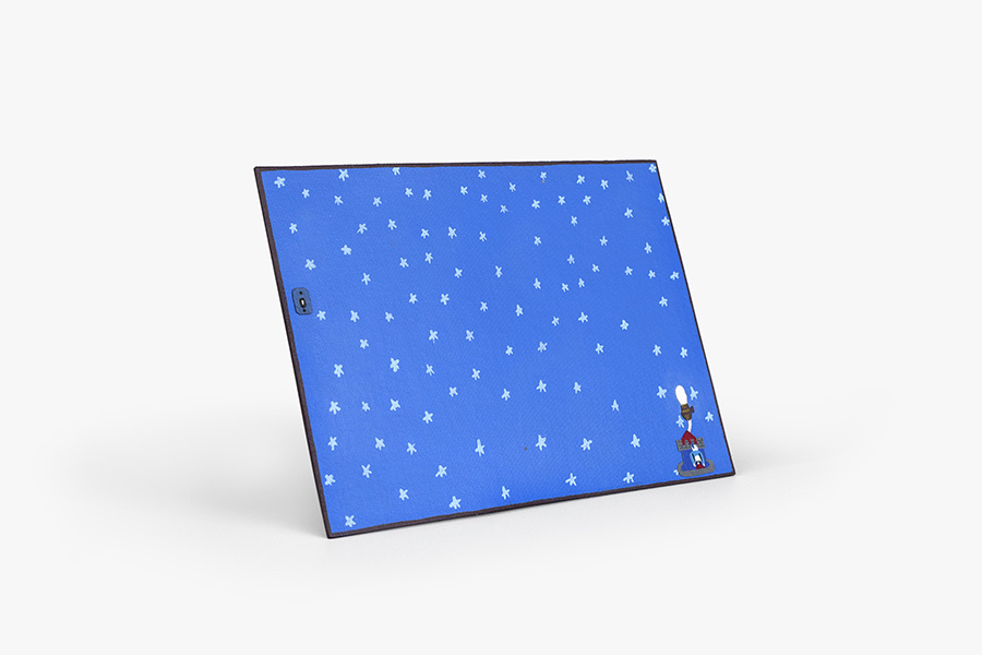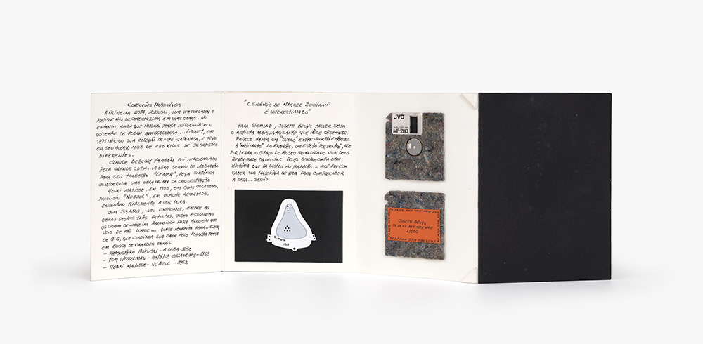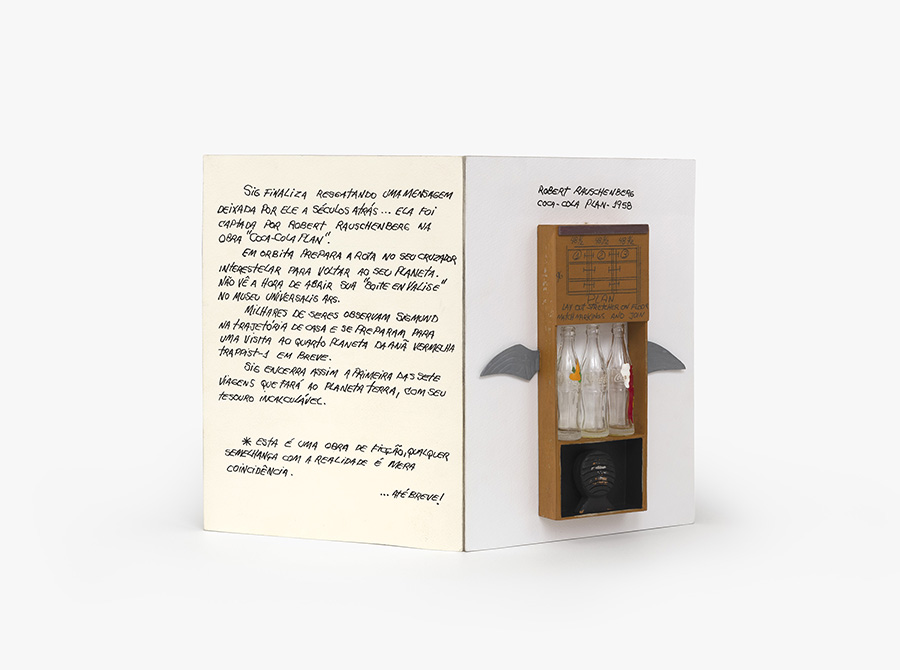 Fernando trabalhou nesse caminho. Produziu uma caixa e inventou uma história sobre um viajante espacial especialmente interessado em obras cujas particularidades assemelham-se ao que conhecemos como obras de arte. Vindo de um outro universo, enveredou pelo nosso planeta, ou melhor, num planeta que não o nosso, embora próximo. Nosso planeta espelhado? A prova é que todas as obras encontradas por ele, como parcialmente se pode constatar nas paredes da galeria e nas reproduções minúsculas embutidas na sua caixa-maleta, embora pareçam-se terrivelmente com obras nossas velhas conhecidas, são diferentes. Acometidas de alguns defeitos. Defeitos? Bem, talvez não se trate disso, talvez isso se deva as previsíveis deformações que o trânsito por universos paralelos deve provocar.