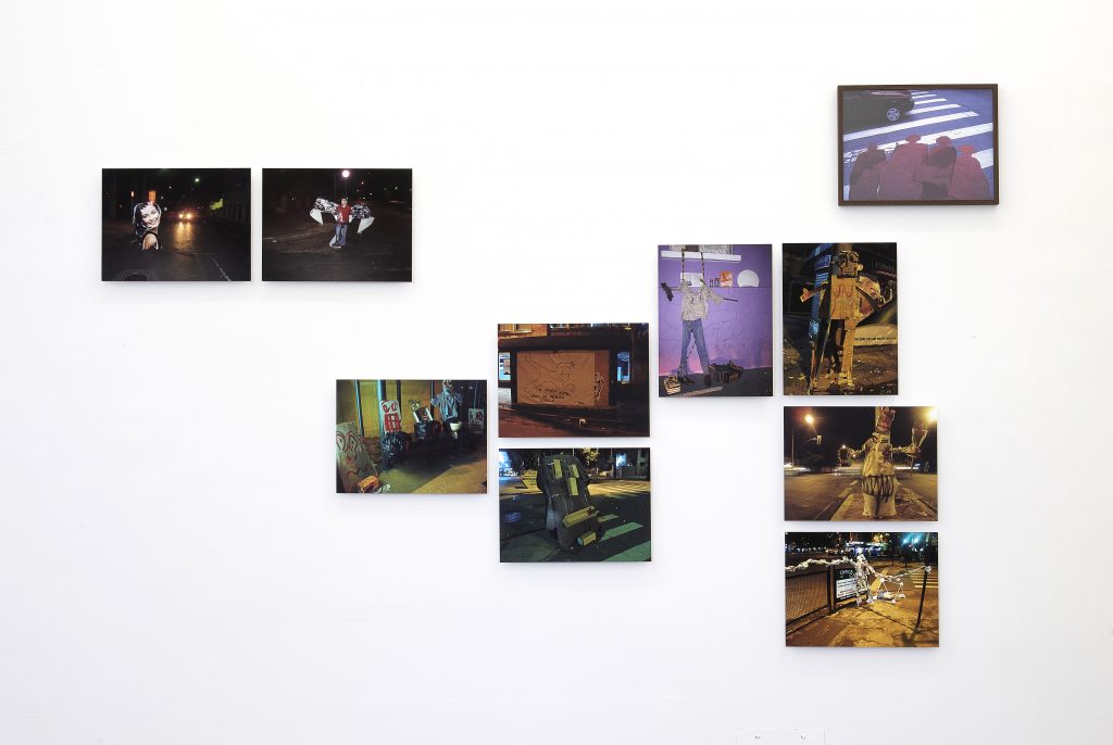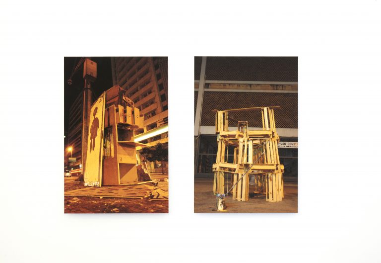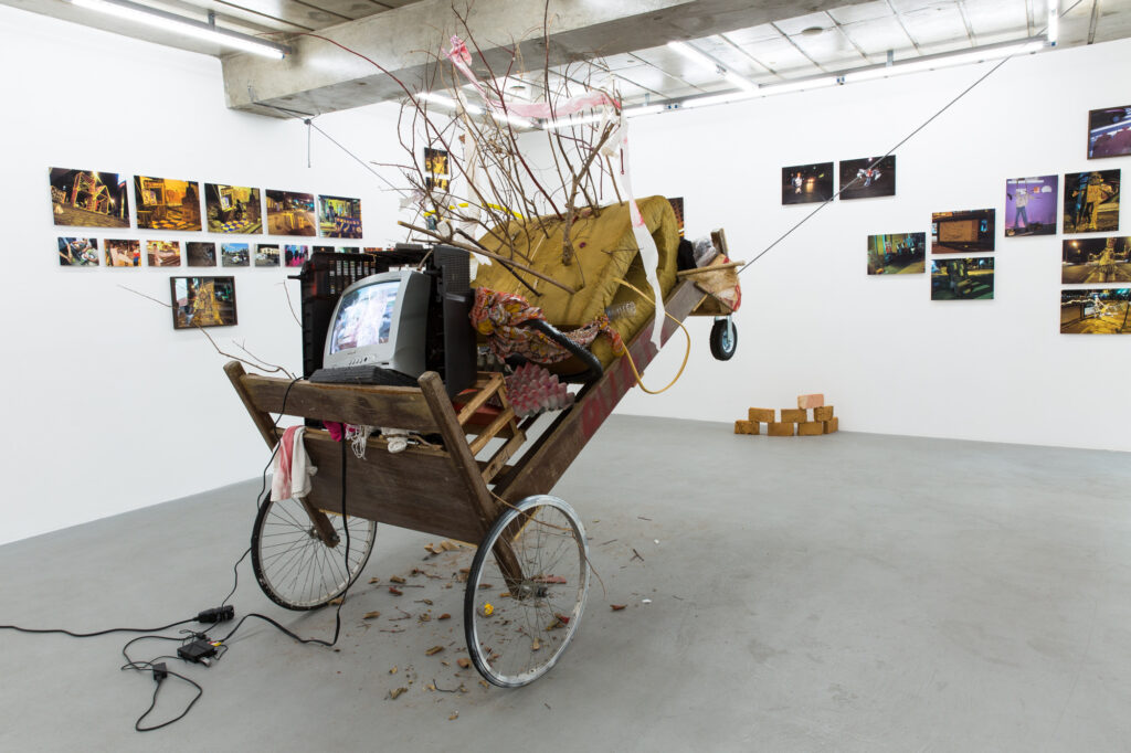 Como se pode ver pela significativa documentação fotográfica apresentada nas paredes da Galeria AM, as derivas propostas pelo “Entre” são de outra ordem, de que são exemplares o carrinho que protagonizou a mais recente delas, a primeira desde o começo da pandemia, e que os intrépidos Desali e Palestina estacionaram no centro da sala da AM. Produto típico da engenhosidade forjada no trato com o precário, tão comum nas periferias das nossas grandes cidades e nos rincões pobres dispersos pelo nosso país, o carrinho, heroicamente empinado como um cavalo por dois cabos que o prendem a viga que corre no teto, tem como chassi os restos de uma cama de solteiro e quatro rodas desiguais, um par de rodas maiores de bicicleta, dessas encontradas em ferro-velho e lixões, numa ponta; e na outra ponta duas menores, com pneus de borracha e estrutura metálica novinhos, possivelmente os únicos itens comprados, emendados à cama por meio de uma estrutura feita por tábuas de madeira reaproveitadas. Sobre a cama há um colchão de espuma arruinado e dobrado, uma mangueira sanfonada amarela, garrafas pet de dois litros, pneus, tranqueiras variadas e indiscerníveis, e uma espécie de touceira esfrangalhada feita de galhos secos, encontrados na rua, provavelmente em caçambas de lixo, enfeitado com uma fita branca chamuscada de tinta vermelha espreiada sobre ela. Na frente do carrinho, apoiada no que um dia foi a cabeceira da cama, uma tevê de tubo de vinte polegadas, passa o filme da ação ocorrida em agosto, portanto há pouco mais de um mês, entre às duas da tarde e às sete da noite. Acompanhados por dois bailarinos do grupo Cultura do gueto, Palestina e Desali saíram do bairro da Lagoinha em direção ao centro de BH, empurrando o carrinho, convocando os curiosos à ação, a se juntarem ao grupo alegre e simples como os saltimbancos dos primeiros filmes de Fellini, improvisando construções, esculturas e instalações fugazes a partir dos objetos e materiais que iam encontrando, todas elas dotadas de sentido crítico. Afinal, fazer do lixo a matéria prima do trabalho, por si só garante a linhagem política de seu trabalho, ao mesmo tempo em que comprova que a arte é um ser em movimento contínuo.
