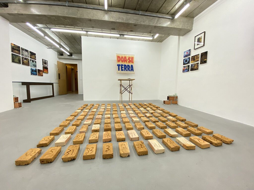 E é certo que se surpreenderá com a obra Doa-se Terra, ocupando o chão e a parede diante do carrinho. No chão, justapostos como uma instalação minimalista, uma coleção de tijolos artesanais numerados pelos mesmos Palestina e Desali, com varetas enquanto o barro estava fresco, como conta um outro vídeo sobre o processo de produção do trabalho. Ao lado das linhas e colunas de tijolos, encostado na parede, há um pequeno embrião de um muro encimado com cacos de vidro, personagem corriqueiro da paisagem urbana, um dos signos clássicos, de agressividade tão frágil quanto ridícula, da proteção das posses. Doa-se terra faz eco ao clamor do Movimento dos Sem-terra, rurais e urbanos, em sua luta perpétua pelo direito a uma casa, no caso das ocupações urbanas, pelo direito de ocupar os incontáveis imóveis cinicamente desocupados à espera de valorização, indiferentes aos impostos devidos, acobertados que são por leis discricionárias. Esse trabalho, ao contrário do que se espera do mercado de arte, não está a venda. O visitante pode apenas escolher o tijolo com o número de sua preferência para que os artistas, simpática e generosamente, empacotem-no e firmem com carimbos e assinaturas o certificado de propriedade. No que diz respeito à esfera artística, uma conduta como essa ensina sobre que efetivamente tem importância.